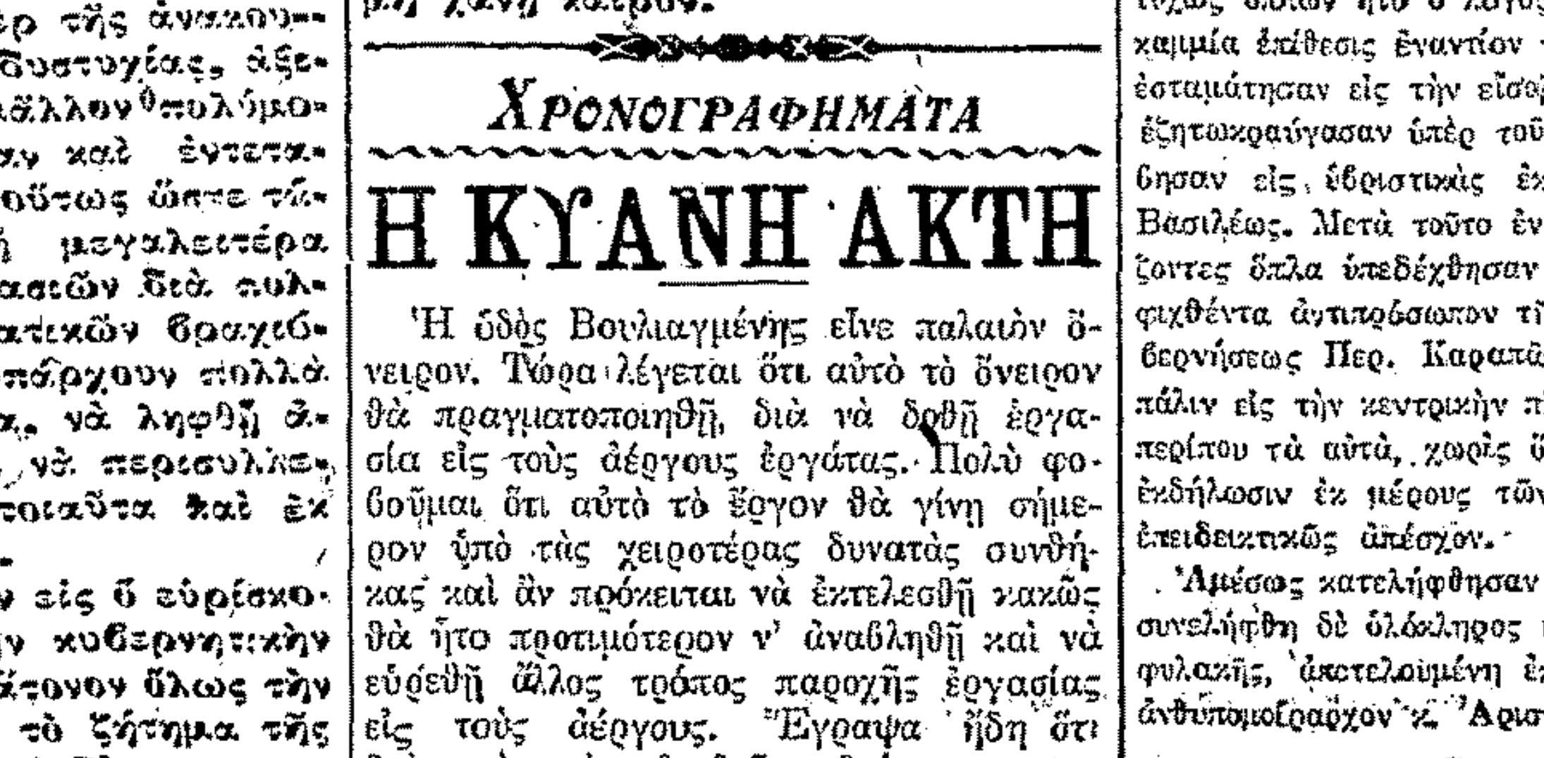 Στο πλαίσιο αυτό πρέπει να τέθηκε για πρώτη φορά η διάνοιξη της παραλιακής λεωφόρου. Μαθαίνουμε γι’ αυτή τη συζήτηση από ένα πολύ ενδιαφέρον χρονογράφημα με τίτλο «Κυανή Ακτή» που δημοσιεύτηκε και πάλι στην εφημερίδα Εμπρός στις 20 Φεβρουαρίου 1917 και υπέγραψε ο Διαβάτης, ψευδώνυμο του κορυφαίου δημοσιογράφου της εποχής και λογοτέχνη Ιωάννη Κονδυλάκη.