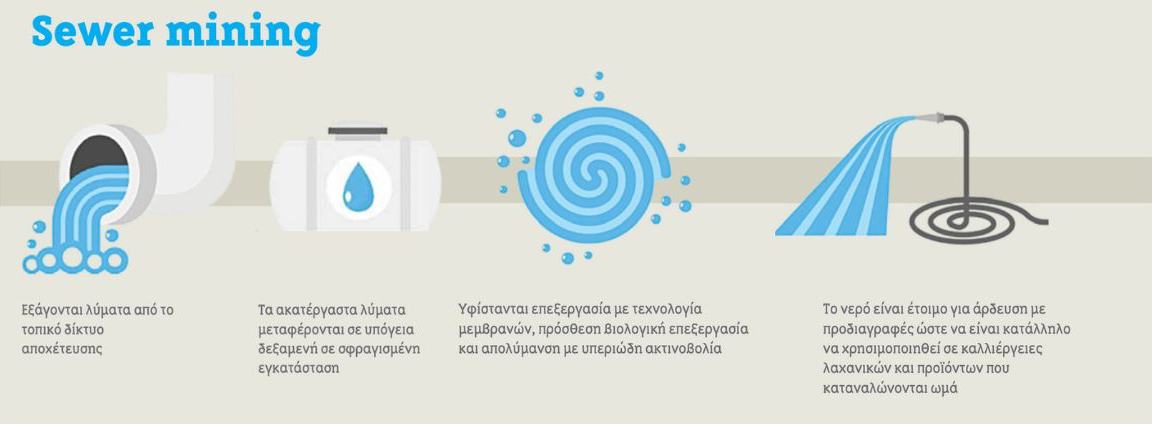 Η ιδέα της ανάκτησης υδάτων βασίζεται στην άντληση από τους αγωγούς της αποχέτευσης που δρομολογούν τα λύματα προς το νησάκι της Ψυτάλλειας. Στα ήδη υφιστάμενα τοπικά αντλιοστάσια της ΕΥΔΑΠ θα δημιουργηθούν υπόγειες δεξαμενές και μια μικρή και κλειστή εξωτερική μονάδα περίπου 24 τετραγωνικών. Από το τοπικό δίκτυο αποχέτευσης θα εξάγονται λύματα, θα υφίστανται επεξεργασία καθαρισμού και έπειτα θα εξάγεται ανακυκλωμένο νερό κατάλληλο για κάθε άρδευση.