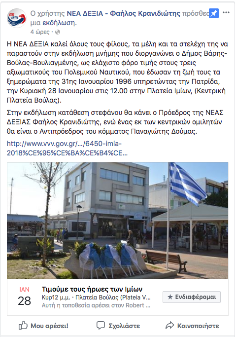 Από τη σελίδα της στο Facebook η Νέα Δεξιά καλεί “όλους τους φίλους, τα μέλη και τα στελέχη της να παραστούν στην εκδήλωση μνήμης που διοργανώνει ο Δήμος Βάρης Βούλας Βουλιαγμένης” την Κυριακή 28 Ιανουαρίου 2018 στην πλατεία Ιμίων της Βούλας, όπου στις 12 μ. θα τελεστεί επιμνημόσυνη δέηση για τα πεσόντα στελέχη του Πολεμικού Ναυτικού στα γεγονότα των Ιμίων.