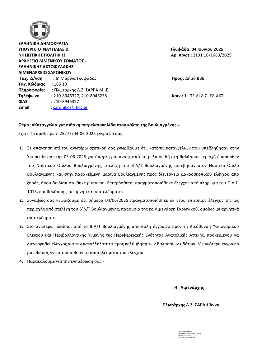 Συγκεκριμένα, για τη διερεύνηση της καταγγελίας, ο Δήμος ήρθε άμεσα σε επικοινωνία με όλους τους εμπλεκόμενους φορείς, τον Ναυτικό Όμιλο Βουλιαγμένης, τη διοίκηση της Astir Marina, τις λιμενικές αρχές καθώς και το Ελληνικό Κέντρο Θαλάσσιων Ερευνών (ΕΛΚΕΘΕ). Σύμφωνα με επίσημη ενημέρωση από το Λιμεναρχείο Σαρωνικού, διενεργήθηκε μακροσκοπικός έλεγχος από ξηράς καθώς και έλεγχος για θαλάσσης στην περιοχή, με αρνητικά αποτελέσματα.