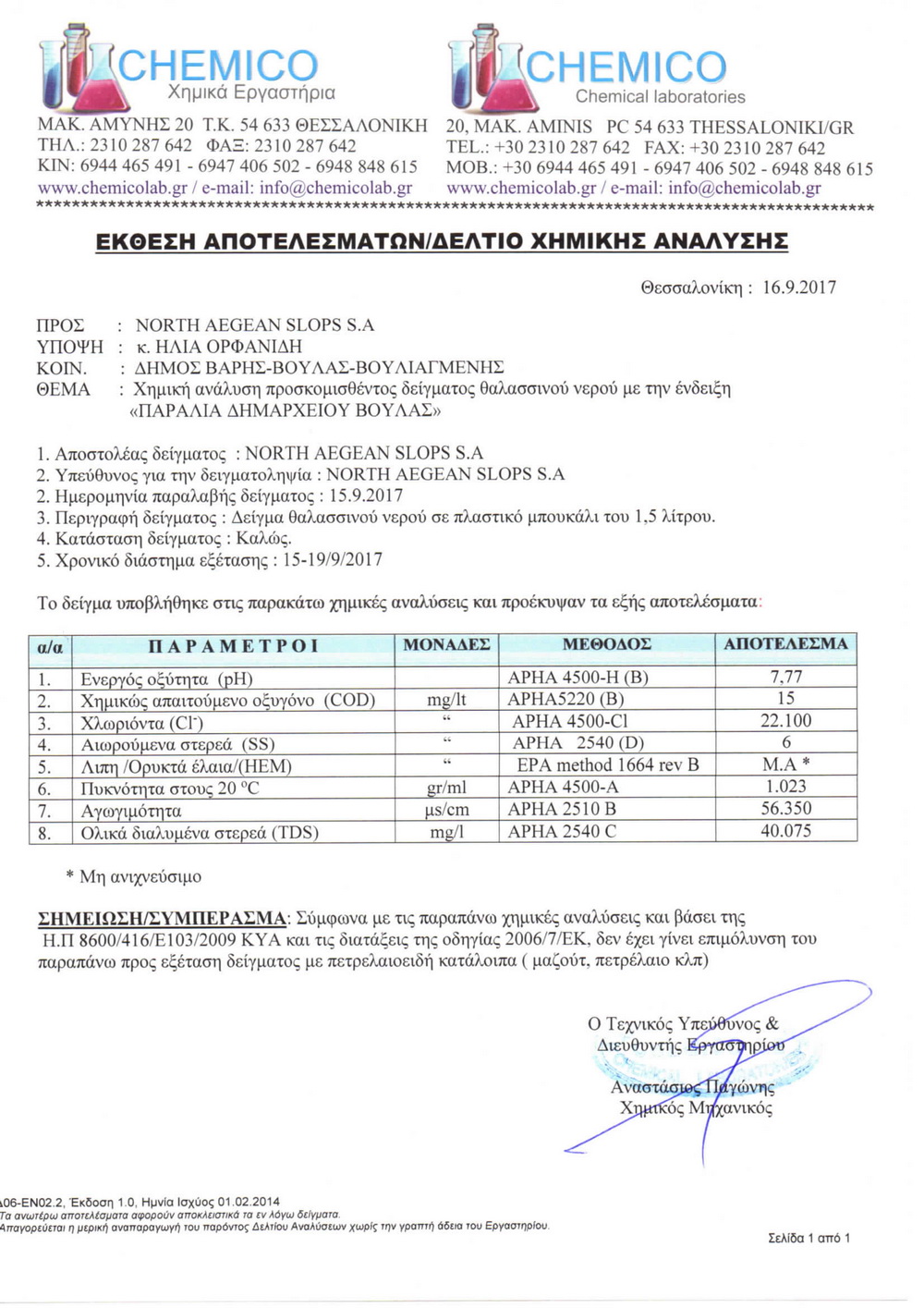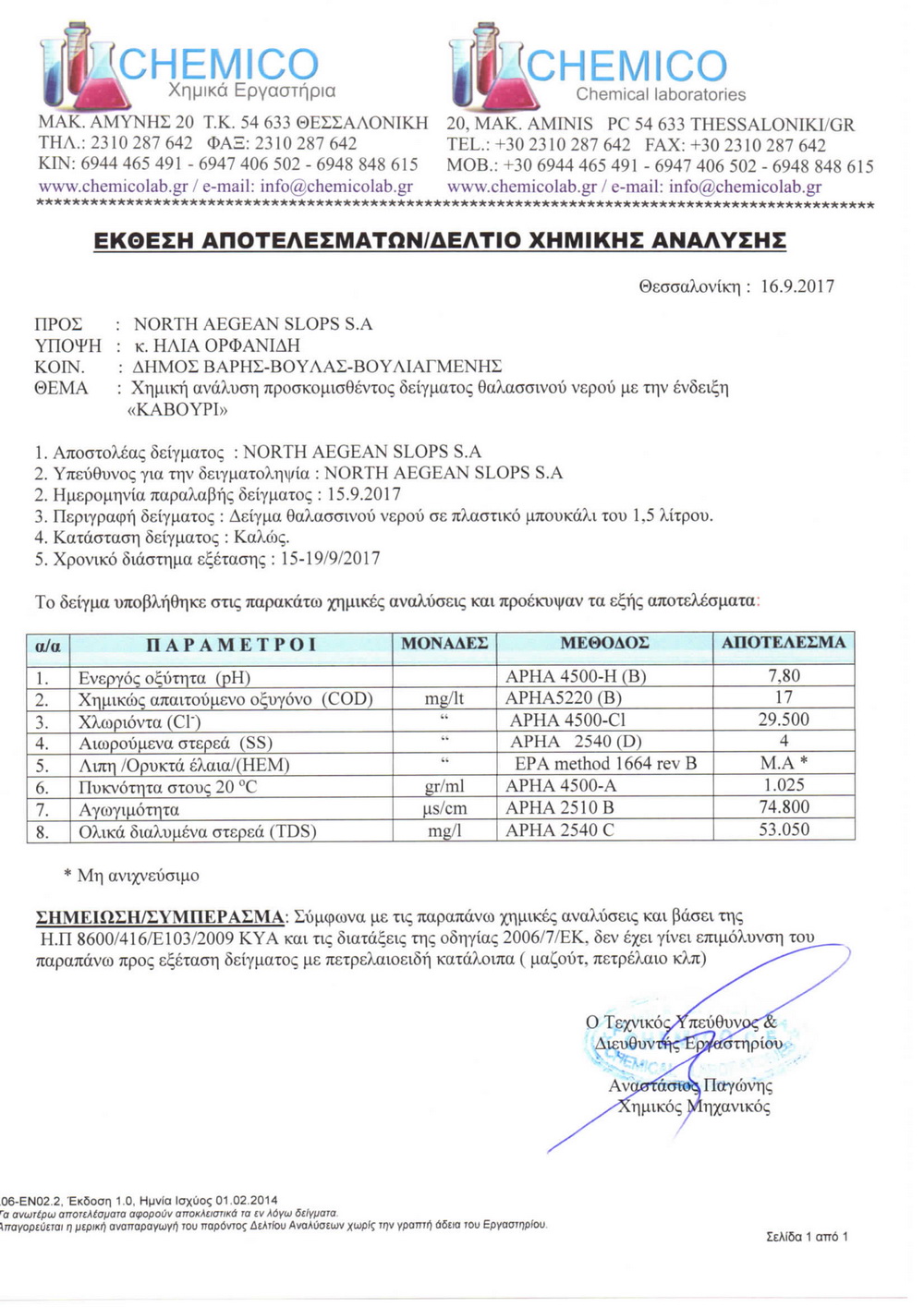 Σε όλες τις αναλύσεις ο Χημικός Μηχανικός που είχε την ευθύνη του ελέγχου, κ. Αναστάσιος Παγώνης, καταλήγει στο εξής συμπέρασμα: