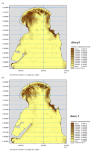 Περαιτέρω, μελετώντας την εξέλιξη της ακτογραμμής σε βάθος 5ετίας, αποδεικνύεται ότι τόσο με την υφιστάμενη κατάσταση όσο και με το νέο λιμενικό έργο “εντοπίζεται περιοδικά εναλλασσόμενη πολύ μικρή υποχώρηση ή προέλαση της ακτογραμμής σε όλο το μήκος της ακτής” με κοινό όμως χαρακτηριστικό και στις δύο περιπτώσεις “ότι οι μεταβολές αυτές ως επί το πλείστον αλληλοαναιρούνται μεταξύ των διαδοχικών ετών, χωρίς ουσιαστικά η ακτή να εμφανίζει σε οποιοδήποτε τμήμα αυτής μια σταθερή τάση προσάμμωσης ή διάβρωσης”.