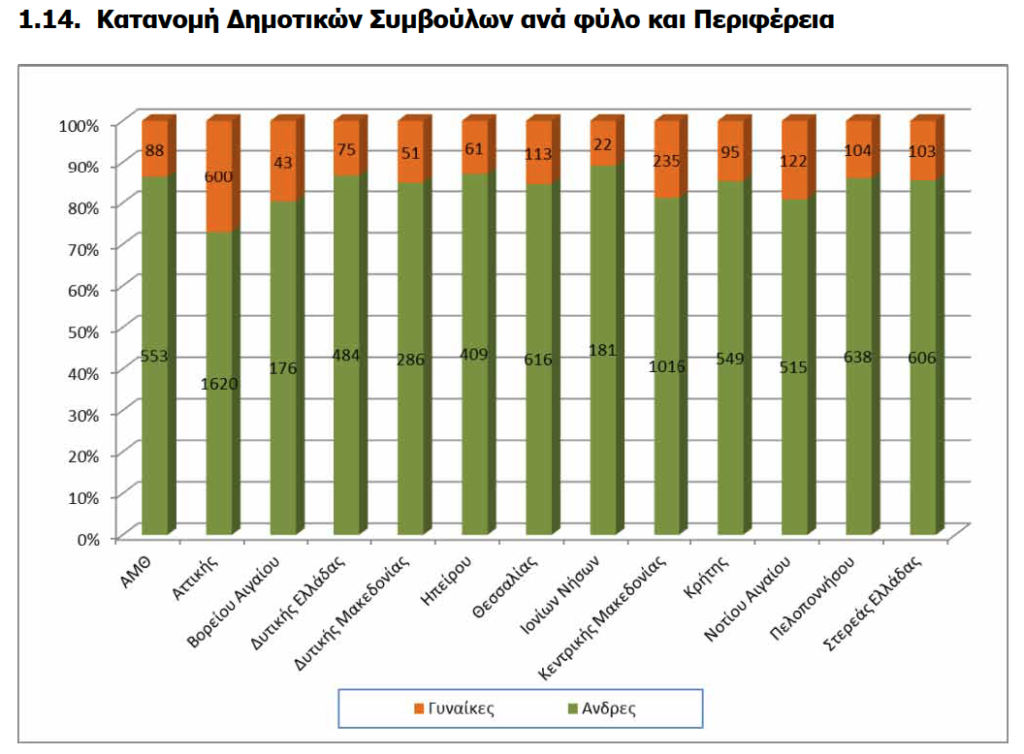 Στους δήμους της Περιφέρειας Αττικής για παράδειγμα, το 73% των δημοτικών συμβούλων (1.620) είναι άνδρες και μόλις το 27% (600) γυναίκες. Στην Περιφέρεια Κεντρικής Μακεδονίας το ποσοστό των ανδρών αιρετών πλησιάζει το 80%, με 1.016 άρρενες δημοτικούς συμβούλους, έναντι 235 γυναικών. Η πλέον ανδροκρατούμενη Περιφέρεια είναι αυτή των Ιονίων Νήσων όπου το ποσοστό των των γυναικών αιρετών είναι μόλις 10% (22 γυναίκες έναντι 181 ανδρών)!