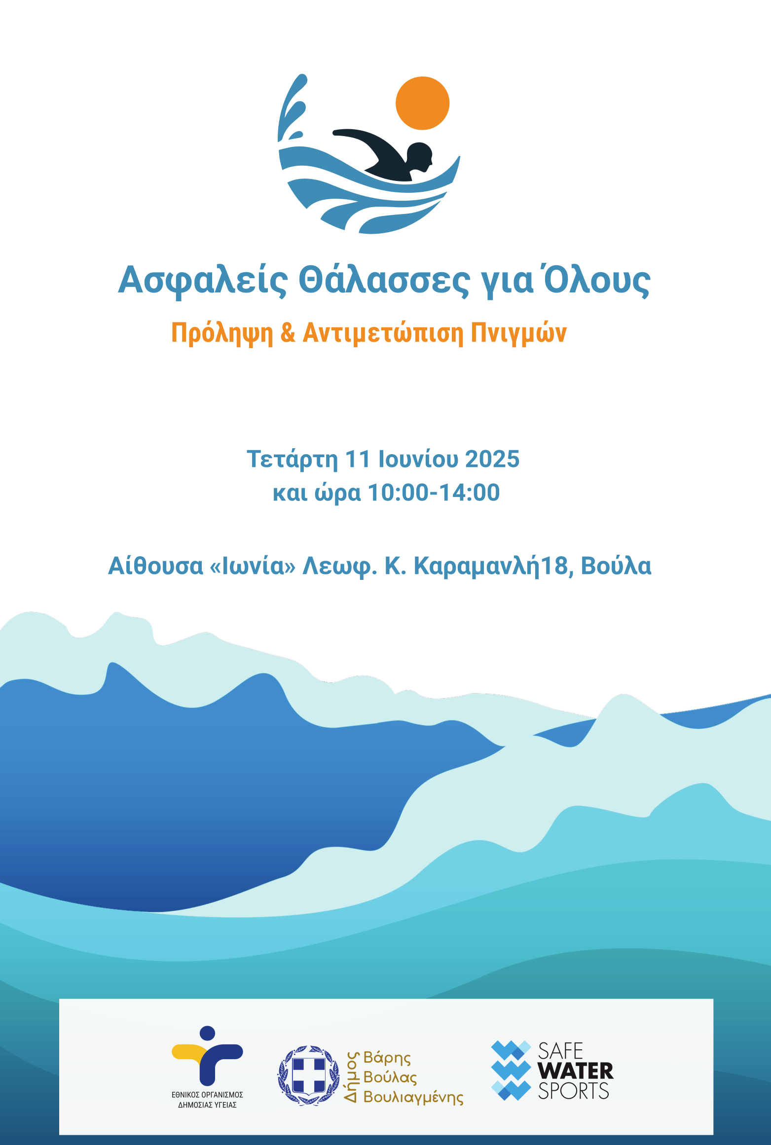 Ενημερωτική εκδήλωση για την πρόληψη των πνιγμών διοργανώνουν ο Δήμος Βάρης Βούλας Βουλιαγμένης, ο Εθνικός Οργανισμός Δημόσιας Υγείας και η οργάνωση Safe Water Sports, την Τετάρτη 11 Ιουνίου στις 10 π.μ. στο πολιτιστικό κέντρο «Ιωνία» (Λεωφ. Κ. Καραμανλή 18, Βούλα).